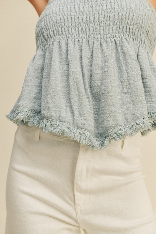 The Details: The Clara Tank Top is made of a cotton gauze material with adorable tassel fringe along the hem. Adjustable traps and elastic rushing around the bust makes it fit perfectly to your body.