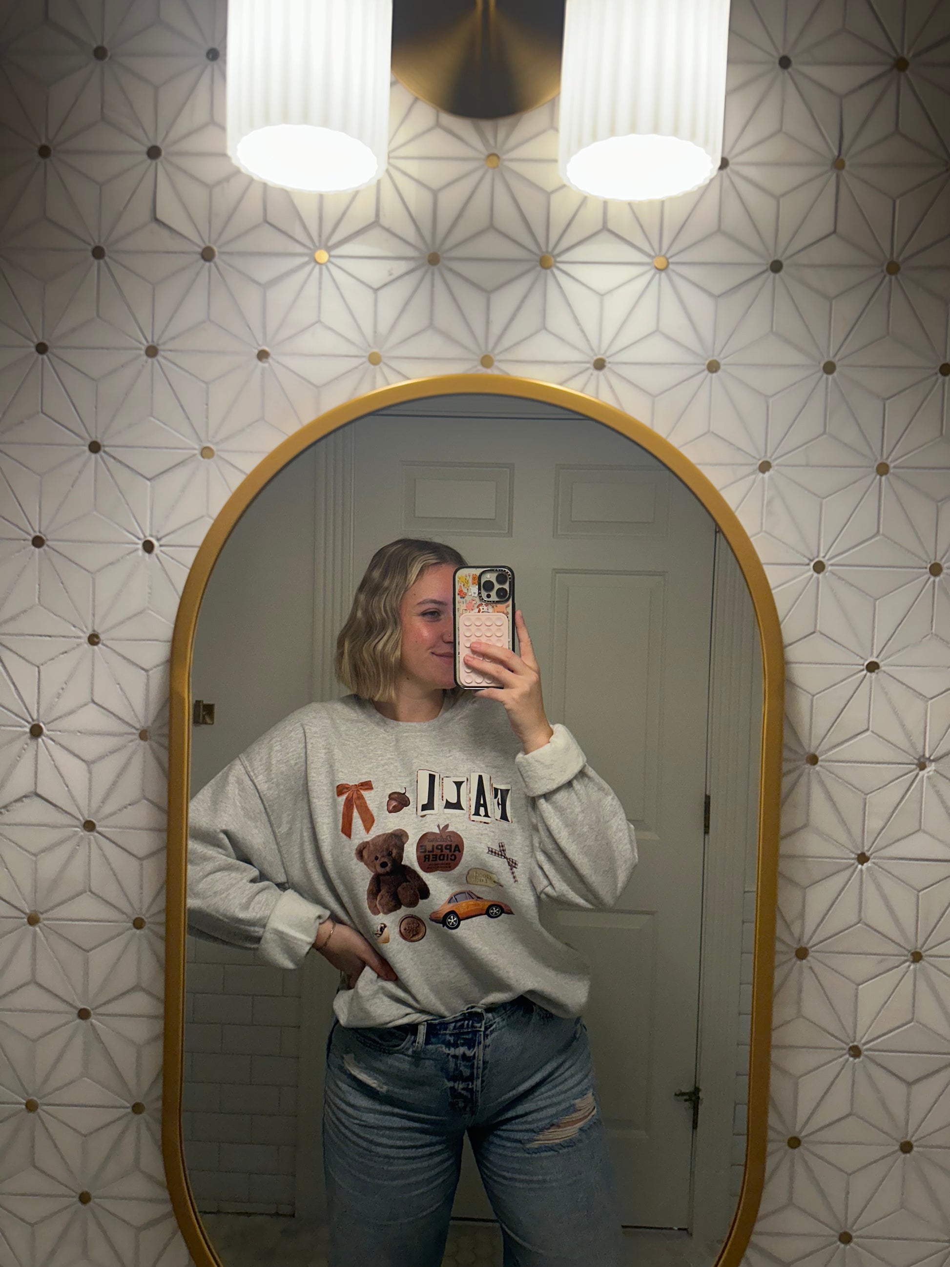FALL MYSTERY SCRAPBOOK SWEATSHIRT! You asked, we listed! We are finally brining our Scrapbook Sweatshirts to online!! We will custom design each sweatshirt to be uniquely yours, this means this item is a mystery, we cannot guarantee which graphics will or will not be used on your sweatshirt. This will be a grey crewneck with various Fall (no Halloween) themed graphics placed on the front of the crewneck.