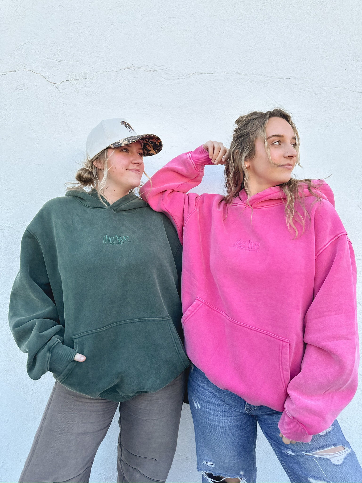 The Details: The comfiest oversized hoodie, made of a thick soft pigment dyed fleece, embroidered with The Ave Logo on the front. This sweatshirt features a unique vintage wash, slight distressing on the hood and of course a kangaroo front pocket.